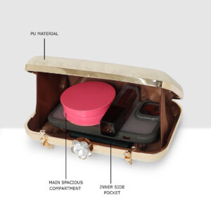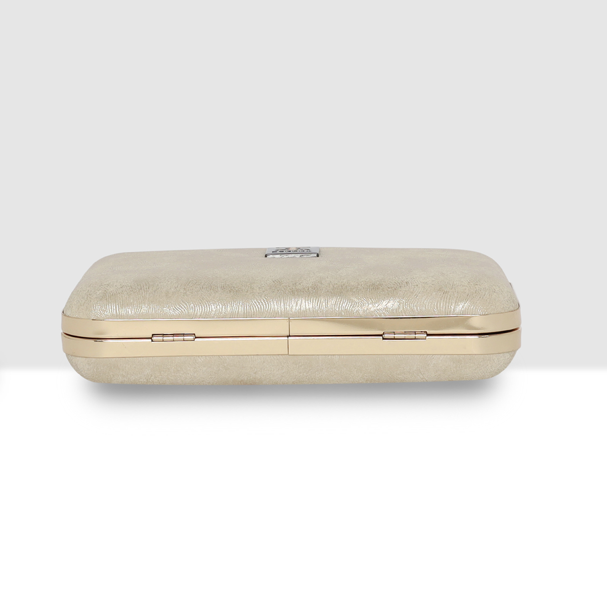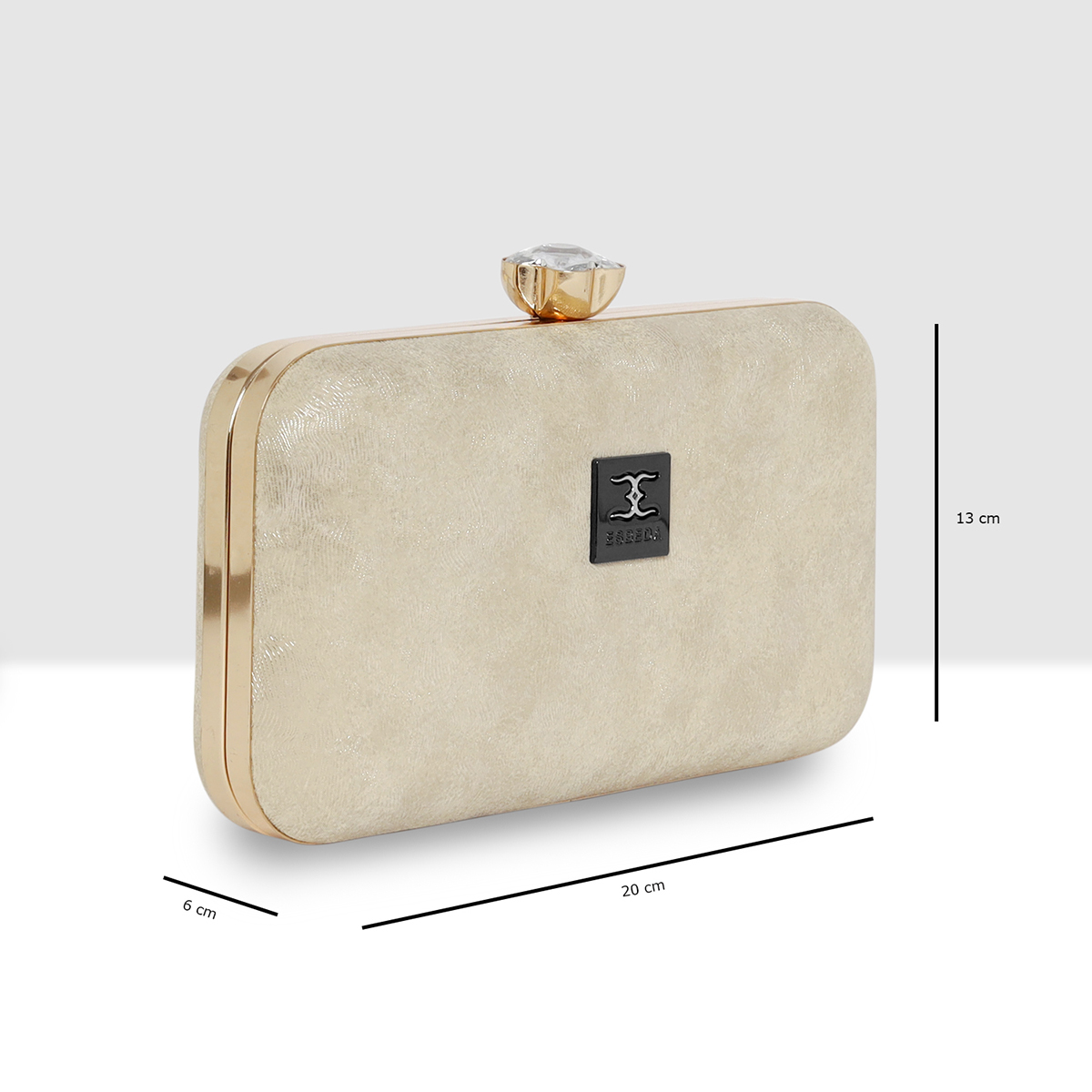 The ESBEDA Dual-Shade Luxe Box Clutch is the perfect accessory for women who appreciate a blend of subtle glamour and premium craftsmanship. This elegant clutch features a unique dual-tone design?a smooth metallic gold finish on one side balanced with a beautifully textured shimmer fabric on the other