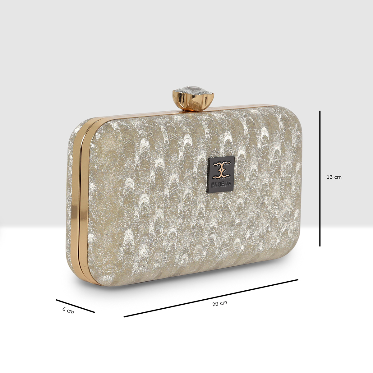 the ESBEDA Sparkle Luxe Evening Clutch, crafted for women who love sophistication with a hint of glamour. The clutch features a beautiful shimmering fabric exterior that catches the light effortlessly, creating a dazzling effect. The front is adorned with the iconic ESBEDA metal logo, reflecting brand authenticity and premium craftsmanship.