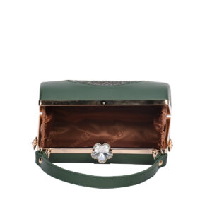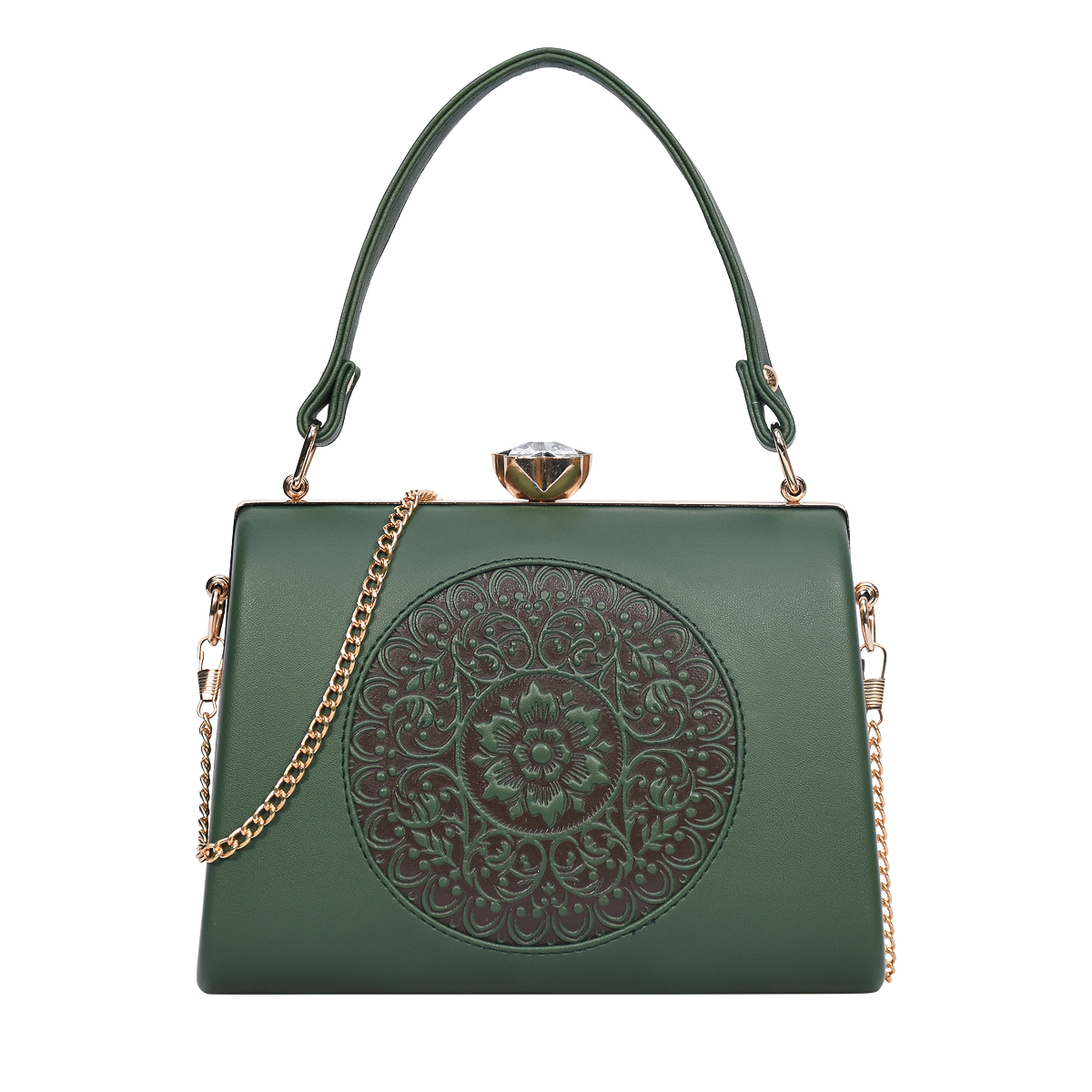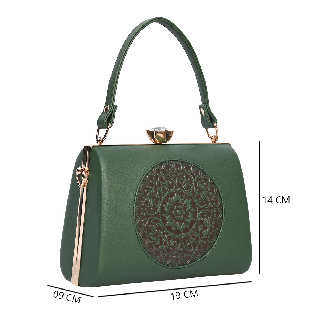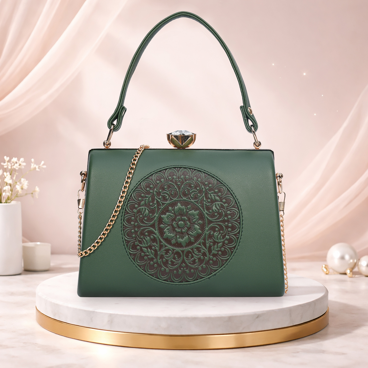 This Clutch features an exquisite mandala-inspired embossed pattern that reflects elegance and artistry. The jewel-style metal clasp adds a touch of glamour, making it a perfect companion for special occasions.