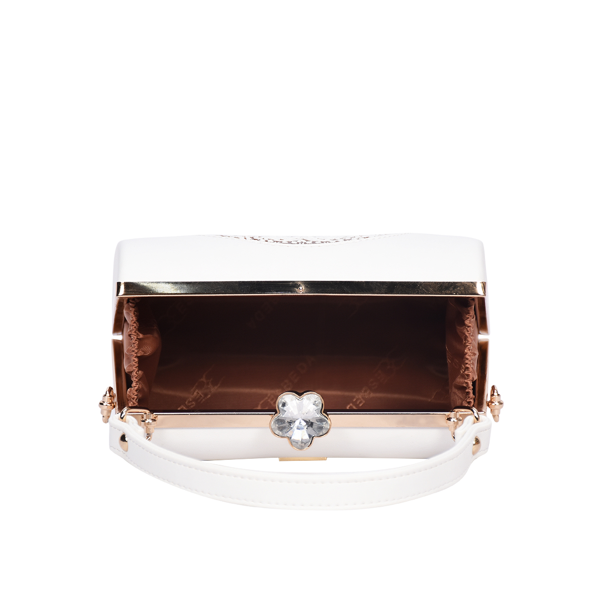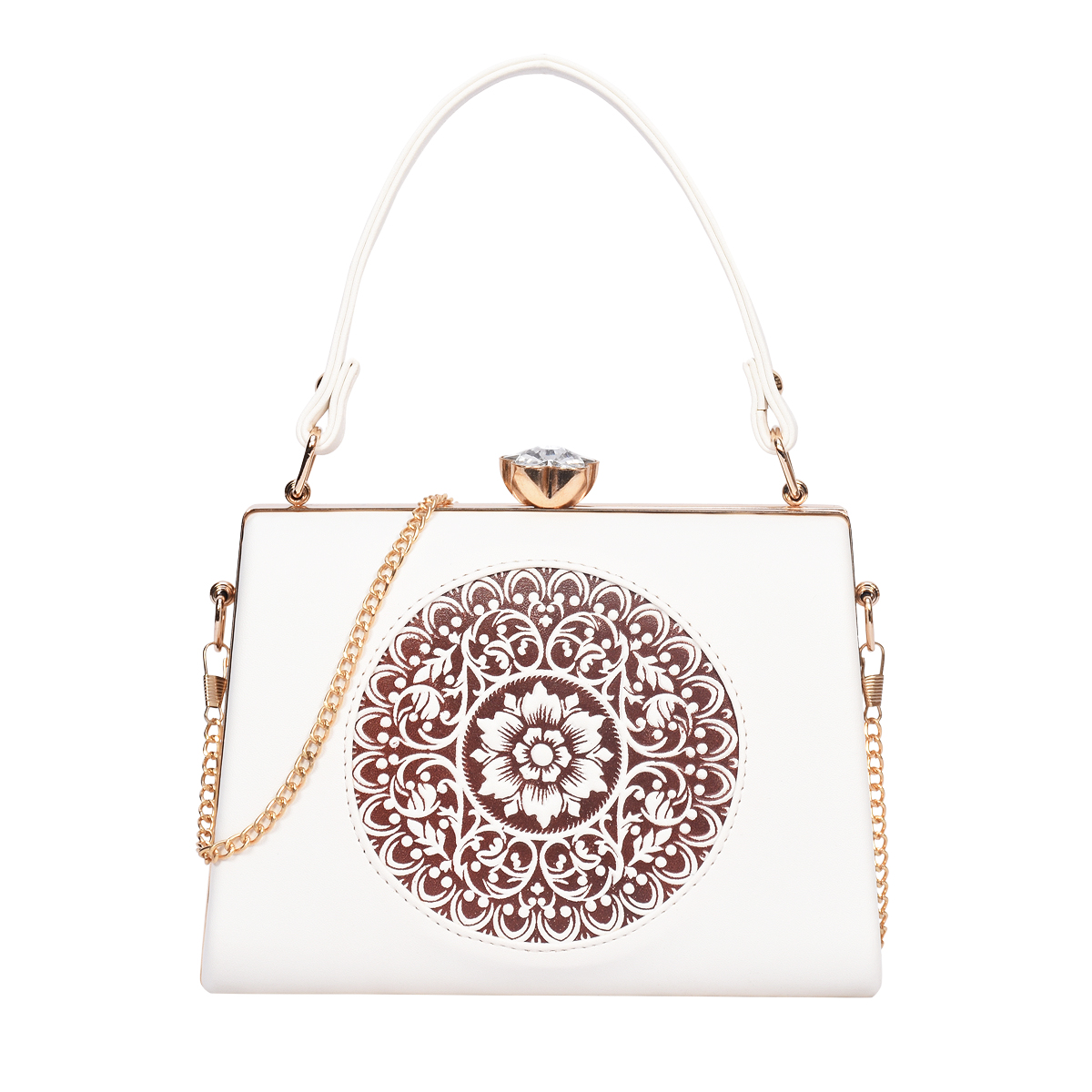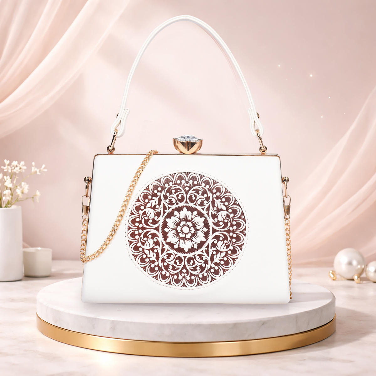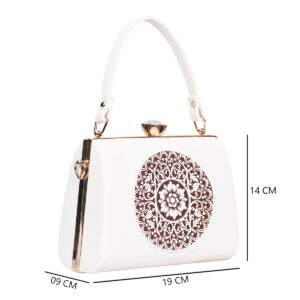 This Clutch features an exquisite mandala-inspired embossed pattern that reflects elegance and artistry. The jewel-style metal clasp adds a touch of glamour, making it a perfect companion for special occasions.