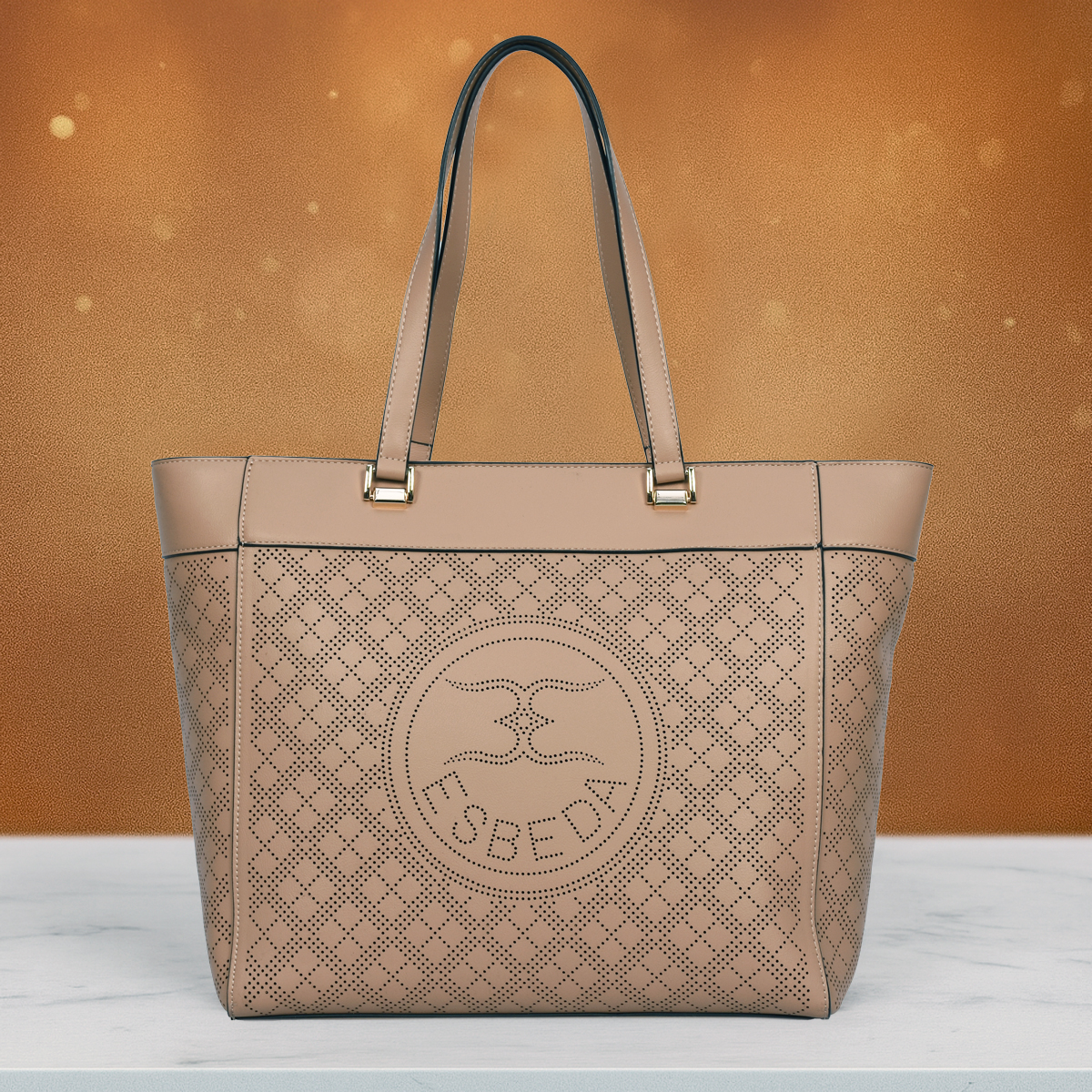 Introducing the Esbeda Prime Emboss Tote, a perfect blend of elegance and modern craftsmanship. Designed with a beautifully perforated geometric pattern and a bold embossed ESBEDA emblem at the center, this tote brings a stylish yet professional look to your everyday wardrobe.