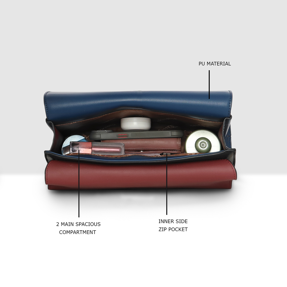 • Its spacious interior easily accommodates daily necessities such as a phone, wallet, and cosmetics.