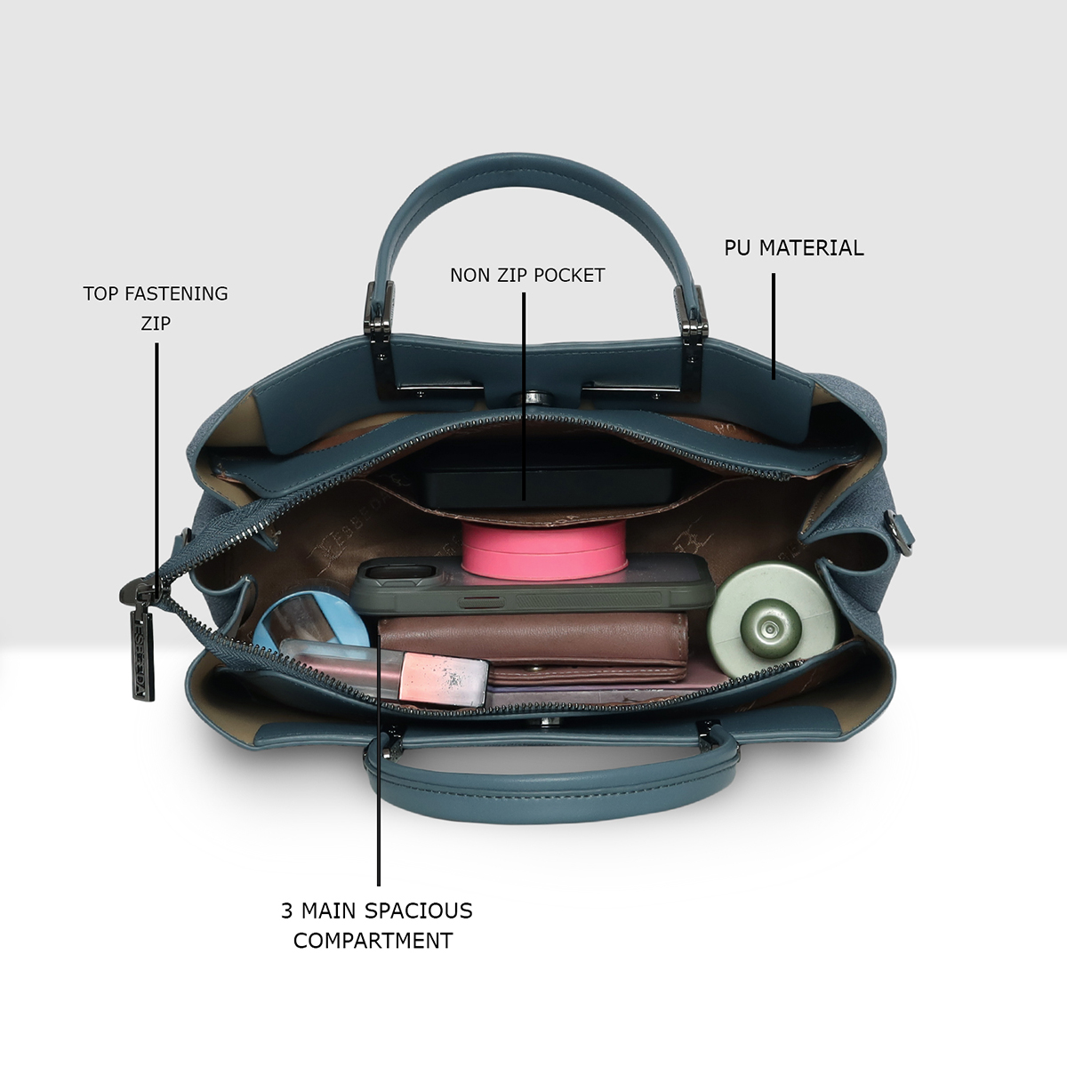 • Spacious Interior Compartment Fits wallet, phone, diary, makeup pouch, and essentials