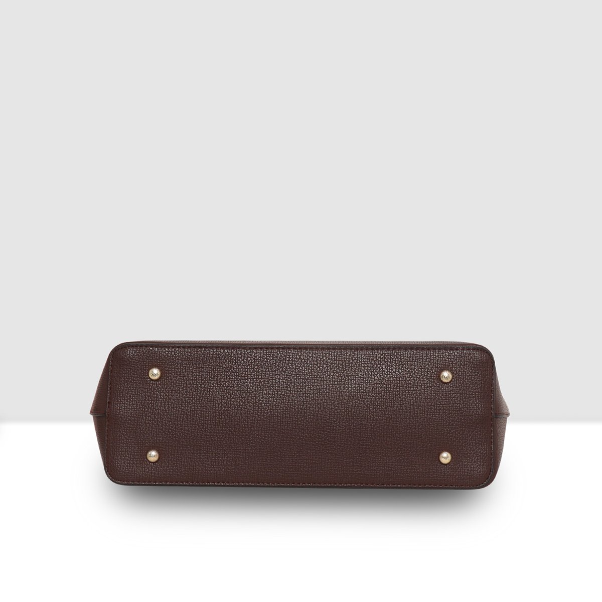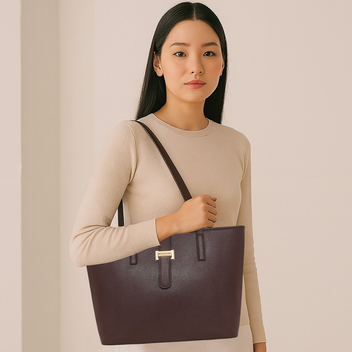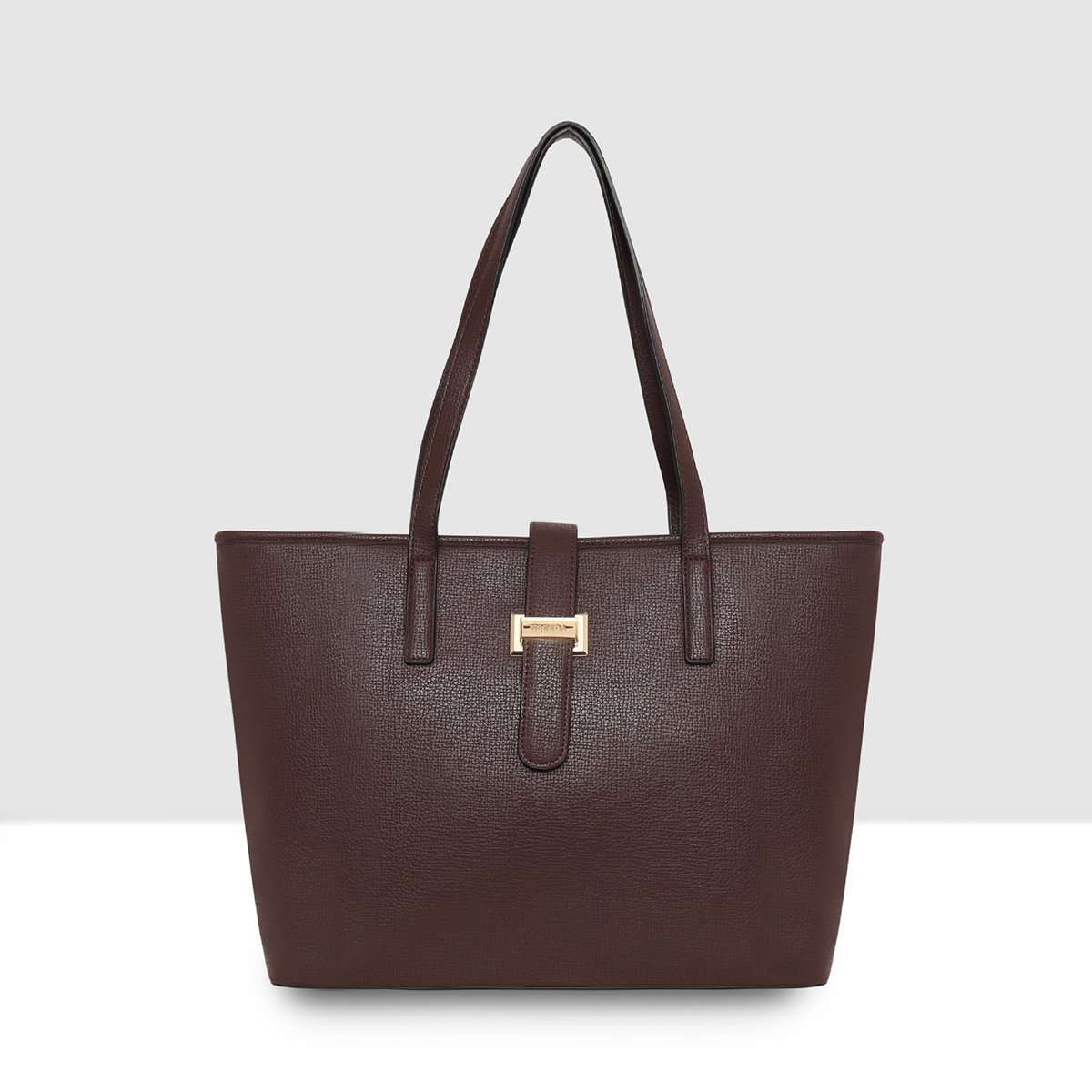 This elegant handbag is crafted from textured faux leather, featuring dual shoulder straps and a sleek front strap for a refined finish. Its spacious interior makes it perfect for everyday essentials while complementing both casual and formal looks.