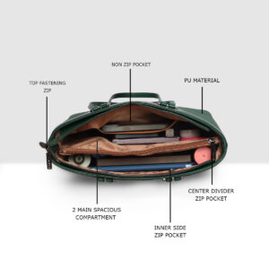 • The spacious interior features two main compartments separated by a secure center zip divider, allowing effortless organization of essentials such as documents, tablets, cosmetics, and personal items.