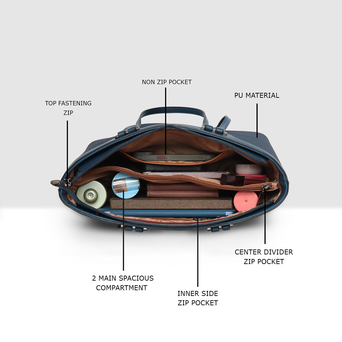 • Multiple internal pockets ensure everything stays neatly in place, while the top zip closure provides added security. Durable, stylish, and versatile, this tote is your ideal everyday companion.