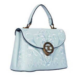 the Esbeda RegalMint Embroidered Top-Handle Bag, a statement accessory crafted to elevate your style. This beautifully designed handbag features intricate white embroidery over a soft mint backdrop, giving it a graceful and royal charm. The unique gold emblem clasp at the center adds a touch of luxury while providing secure storage for your essentials.