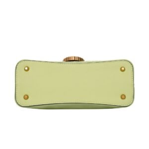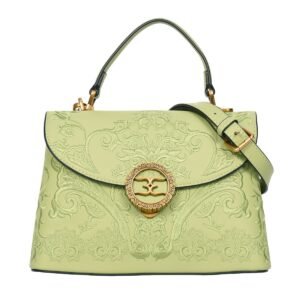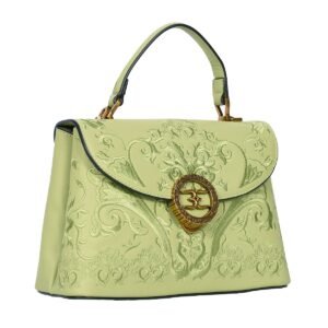 the Esbeda RegalMint Embroidered Top-Handle Bag, a statement accessory crafted to elevate your style. This beautifully designed handbag features intricate white embroidery over a soft mint backdrop, giving it a graceful and royal charm. The unique gold emblem clasp at the center adds a touch of luxury while providing secure storage for your essentials.