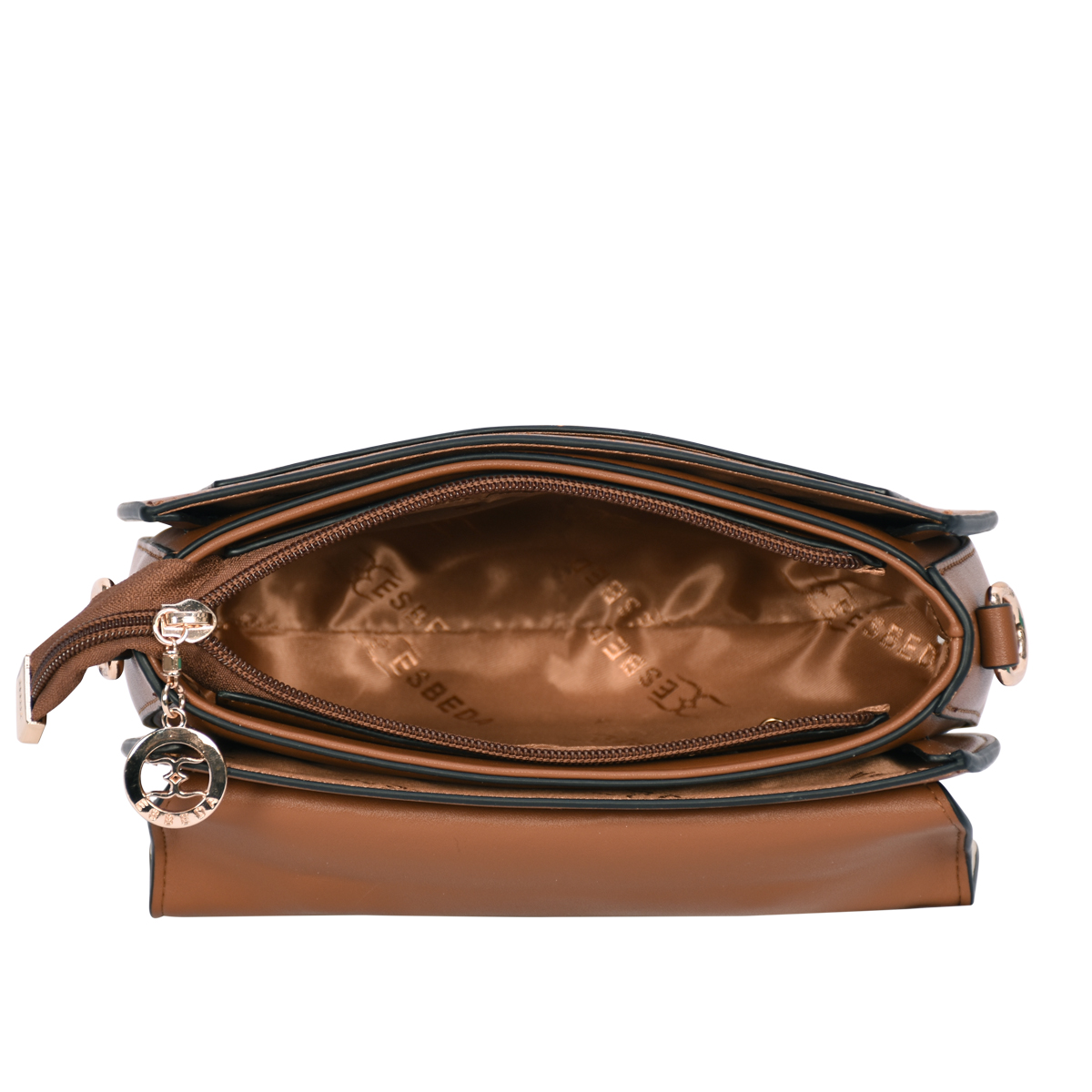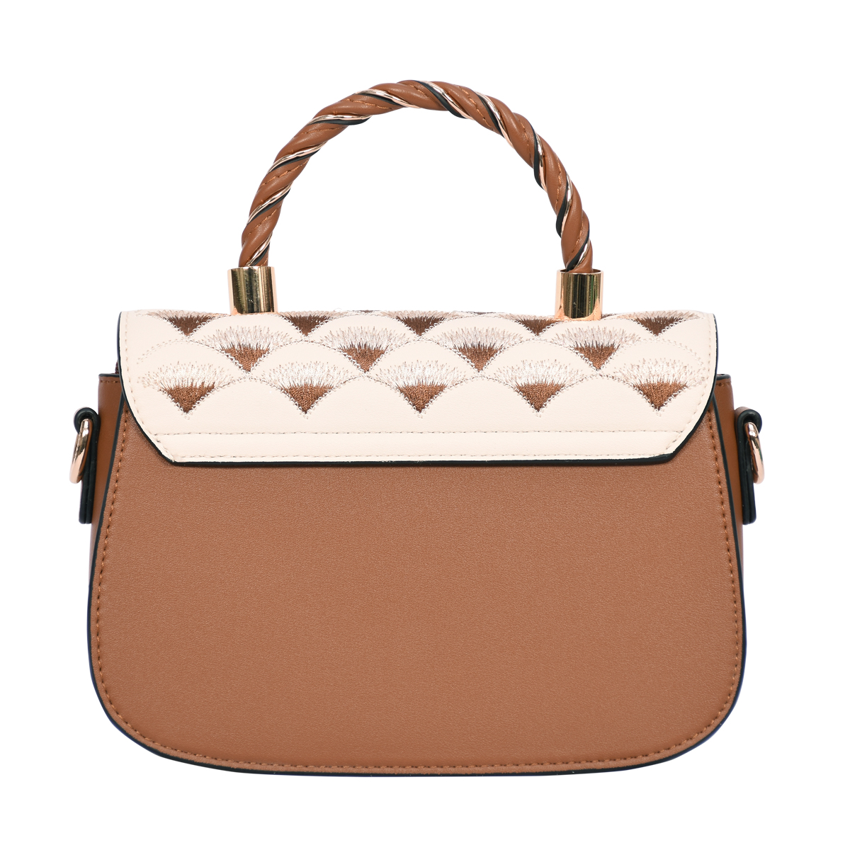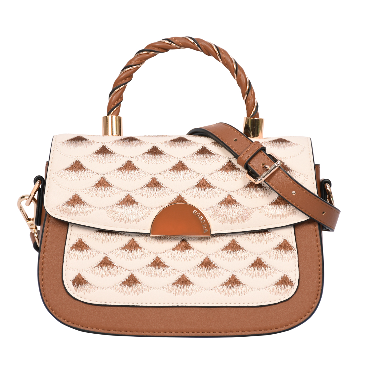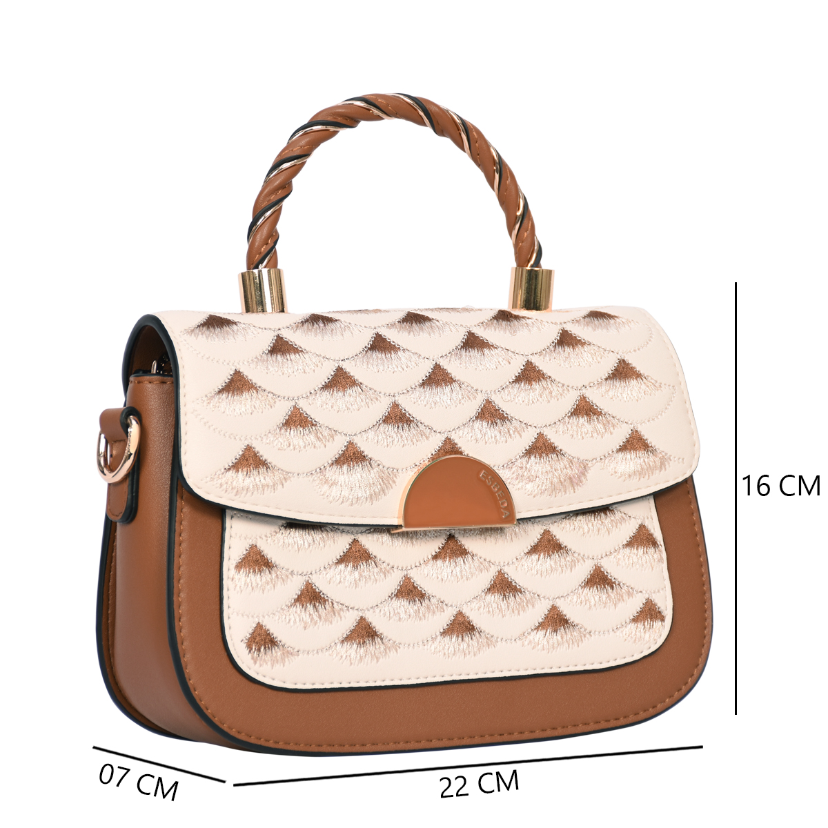 the Esbeda AuraWave Embroidered Mini Satchel, a beautifully crafted handbag designed for the modern woman who appreciates artful detailing. The bag showcases a stunning embroidered pattern across the front and flap, creating a unique texture and eye-catching appeal.