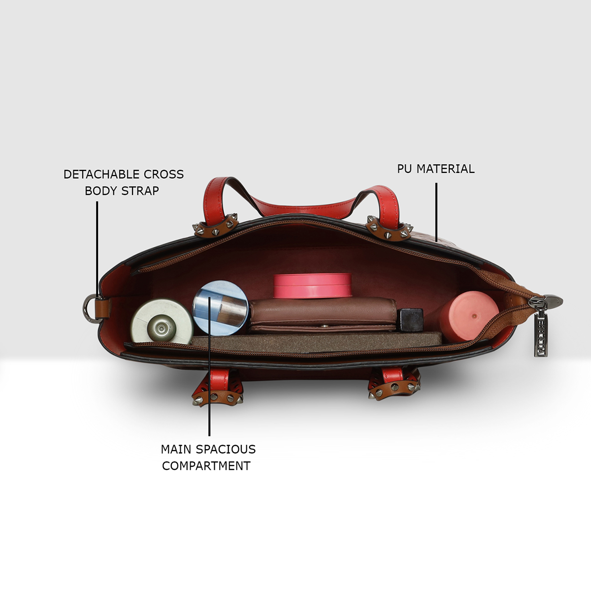 • The spacious bag design easily accommodates daily essentials such as a wallet, phone, cosmetics, and documents.