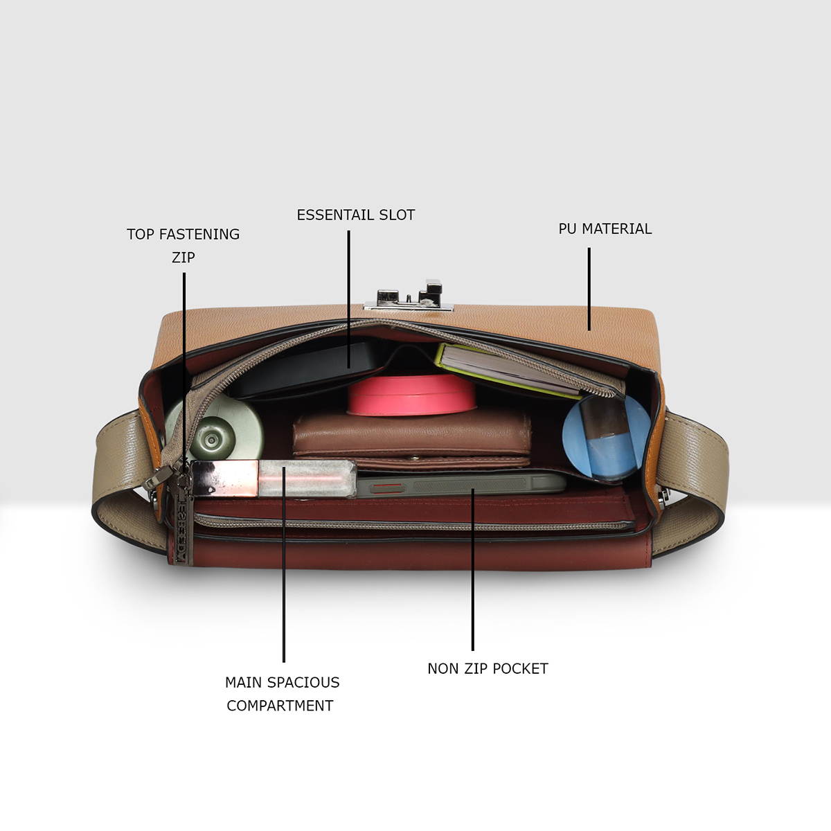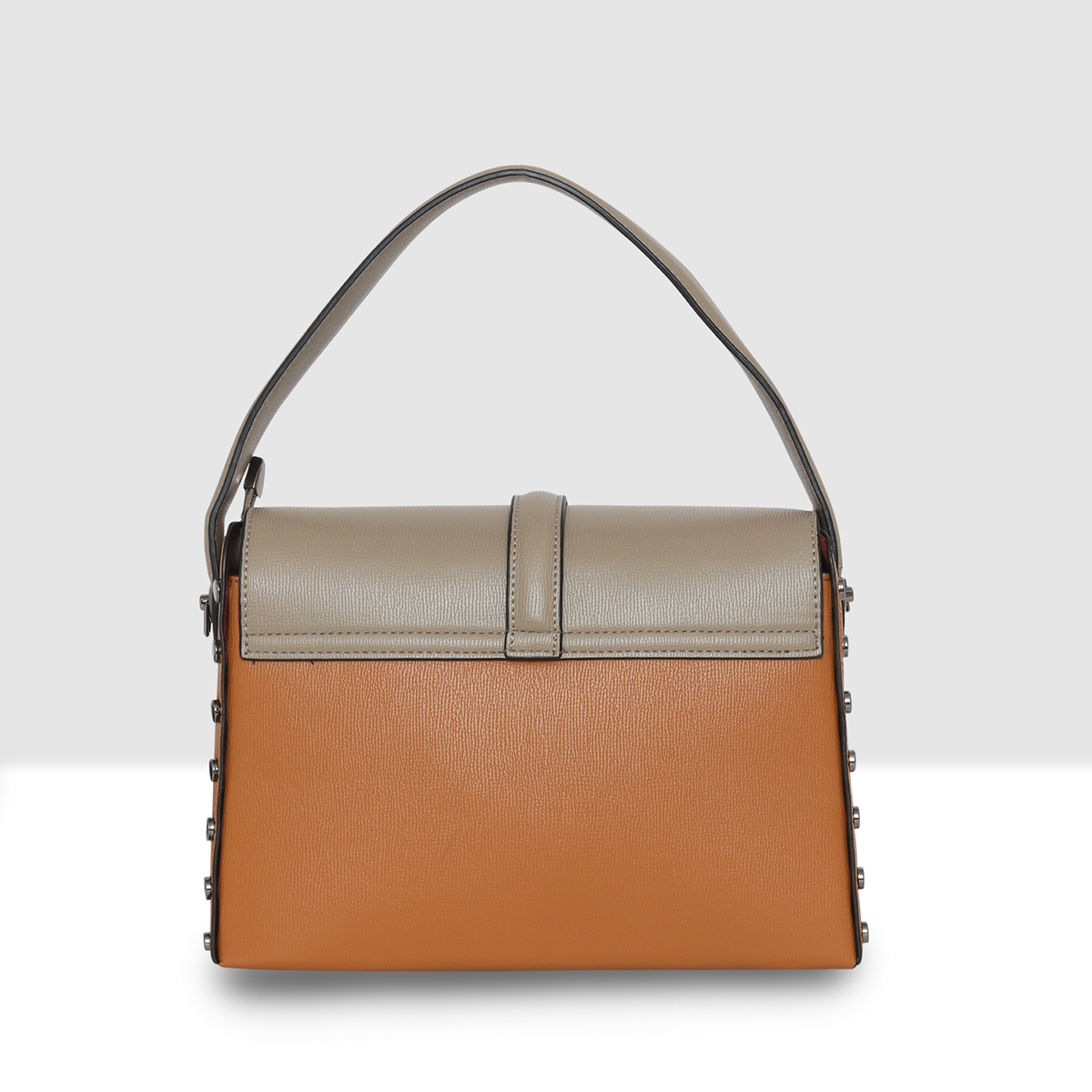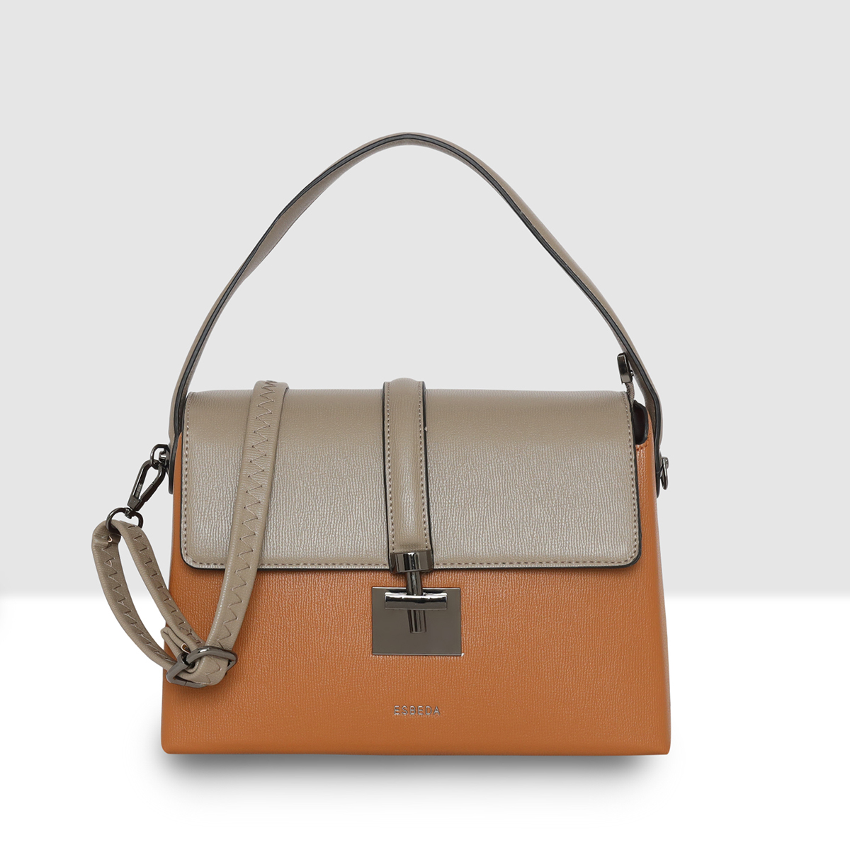 the ESBEDA Clara Lock Flap Handbag. Designed with a sophisticated dual-tone finish and a sleek metal lock closure, this handbag effortlessly blends modern style with classic charm.