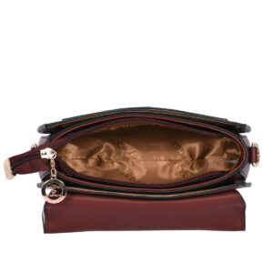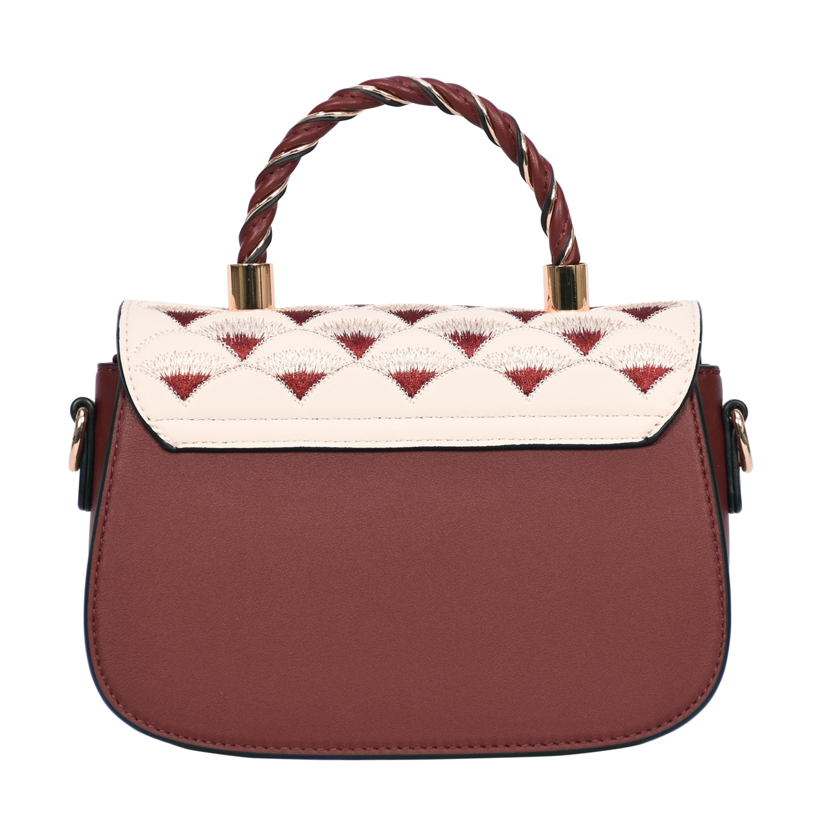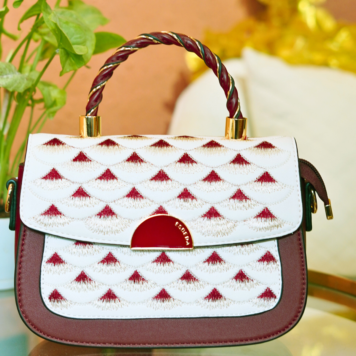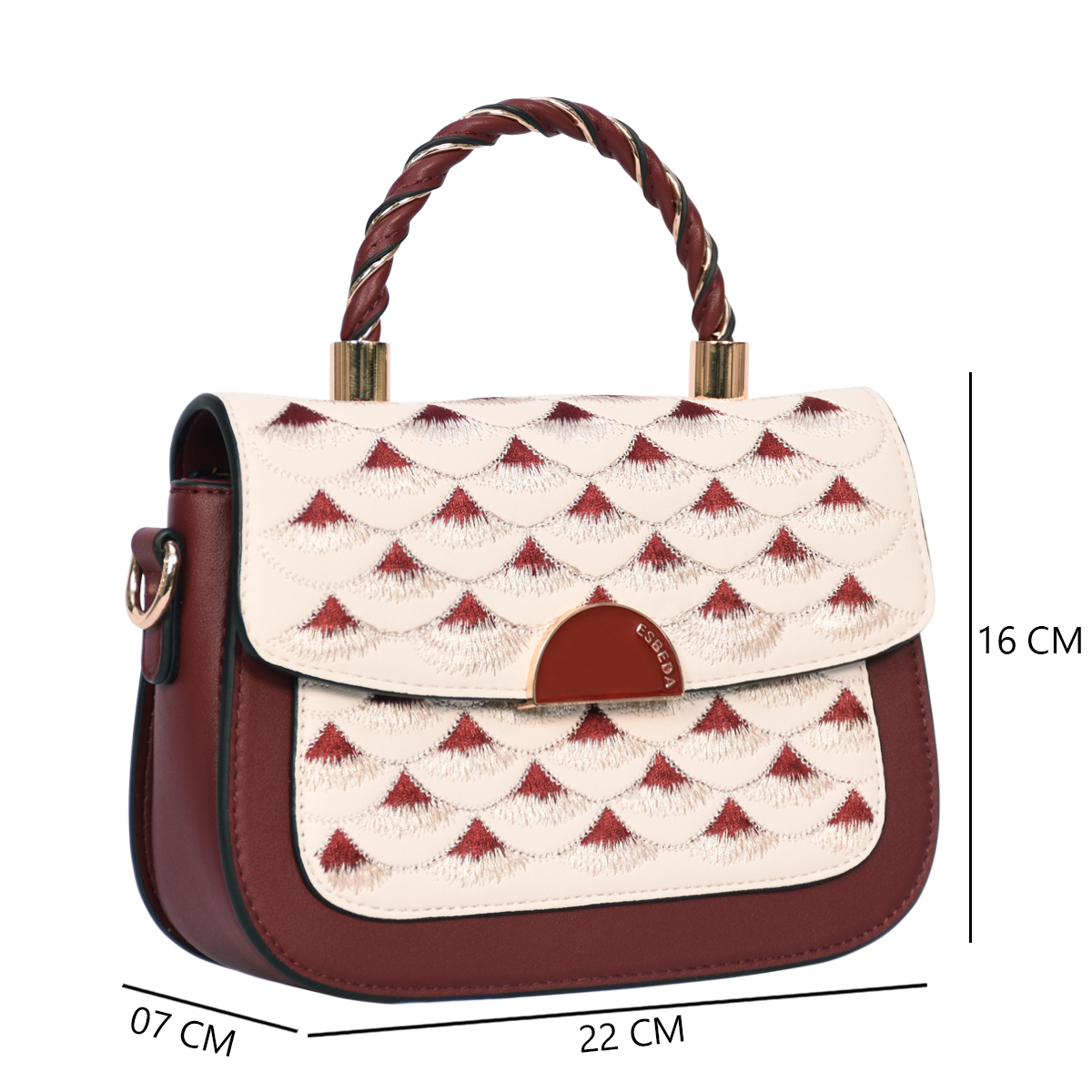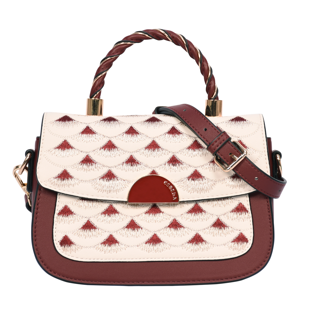 the Esbeda AuraWave Embroidered Mini Satchel, a beautifully crafted handbag designed for the modern woman who appreciates artful detailing. The bag showcases a stunning embroidered pattern across the front and flap, creating a unique texture and eye-catching appeal.