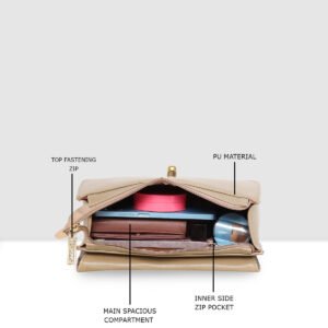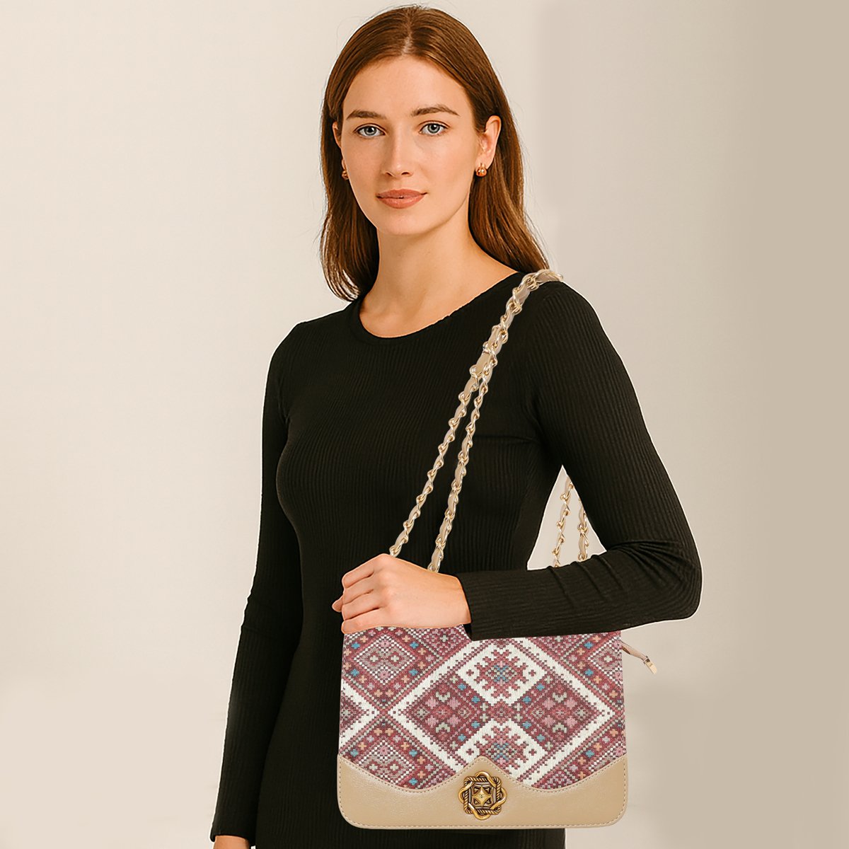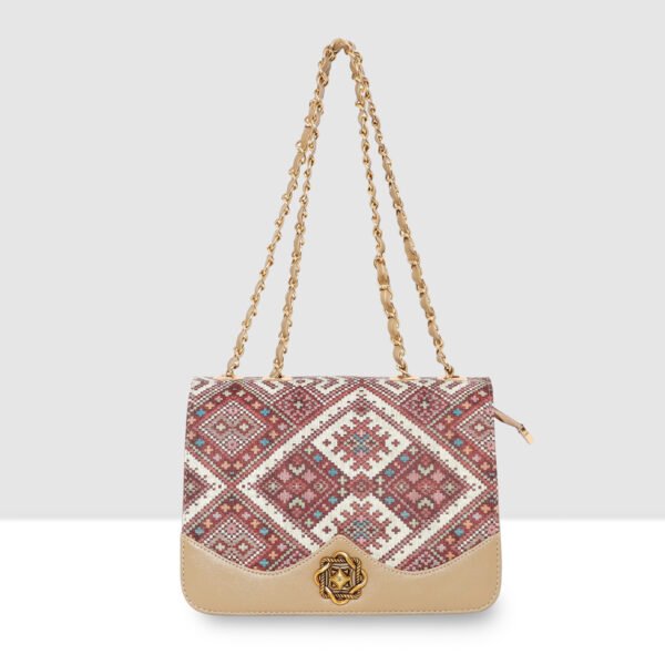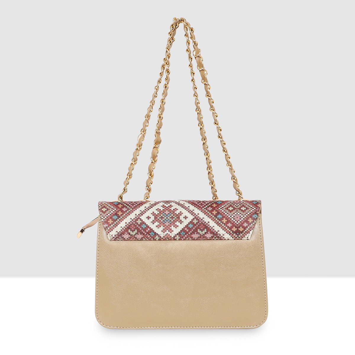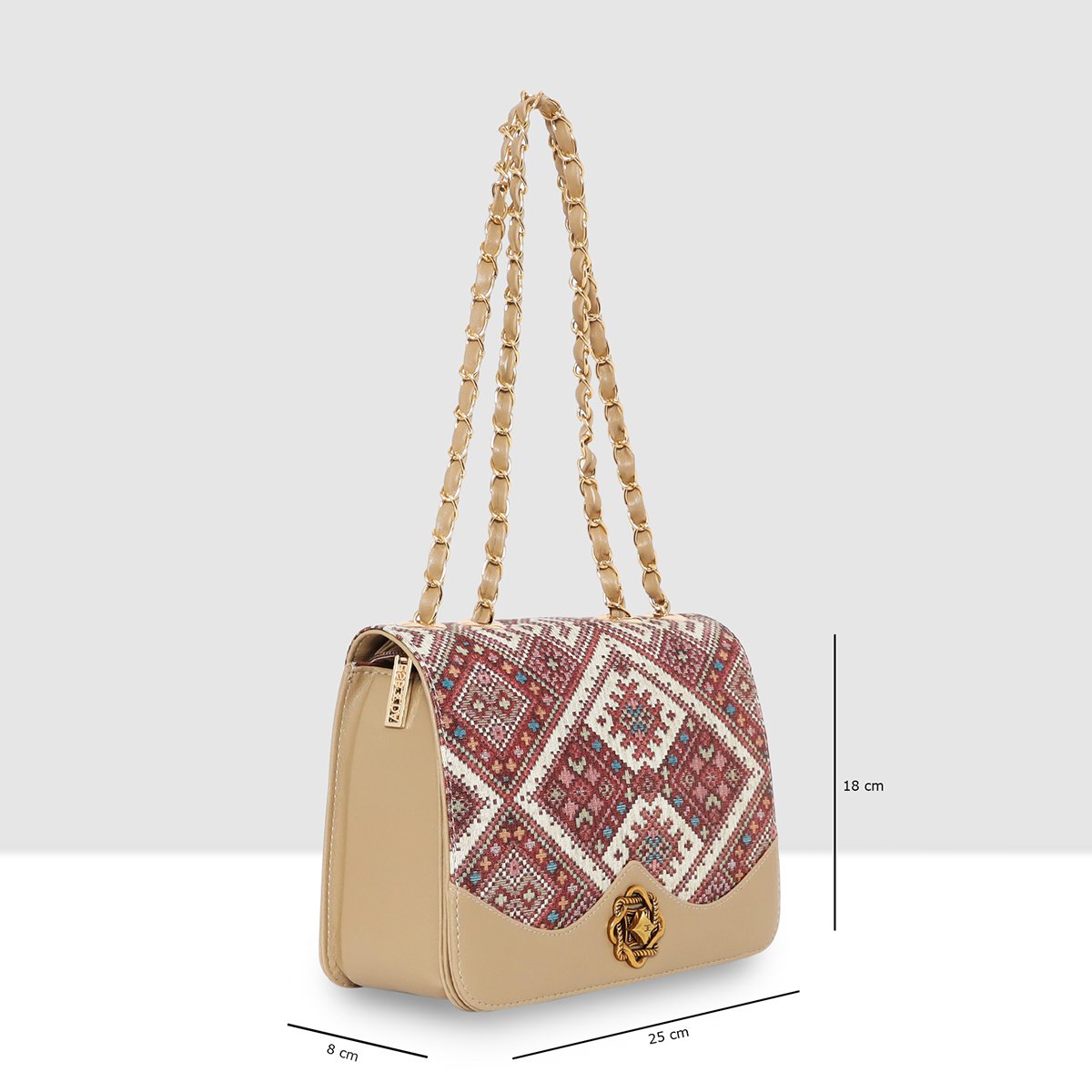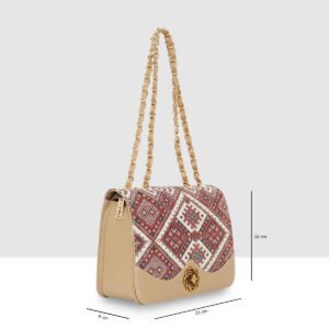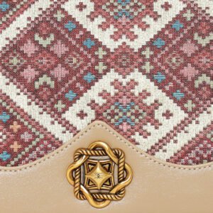 The Esbeda Ethnic Charm Sling combines traditional artistry with modern functionality. it features an eye-catching ethnic pattern on the flap, enhanced with a bold lion emblem closure