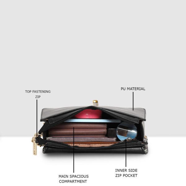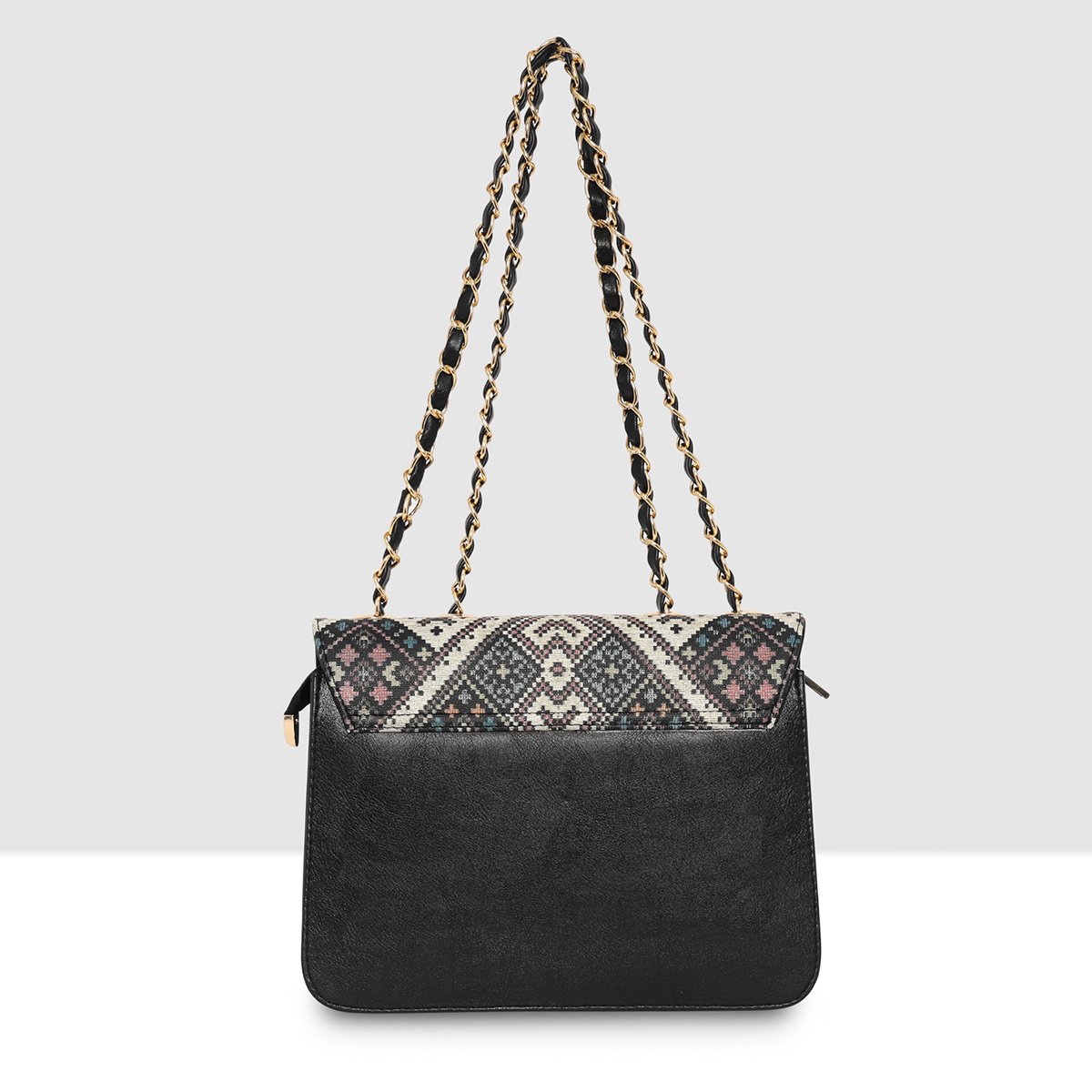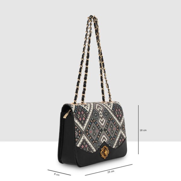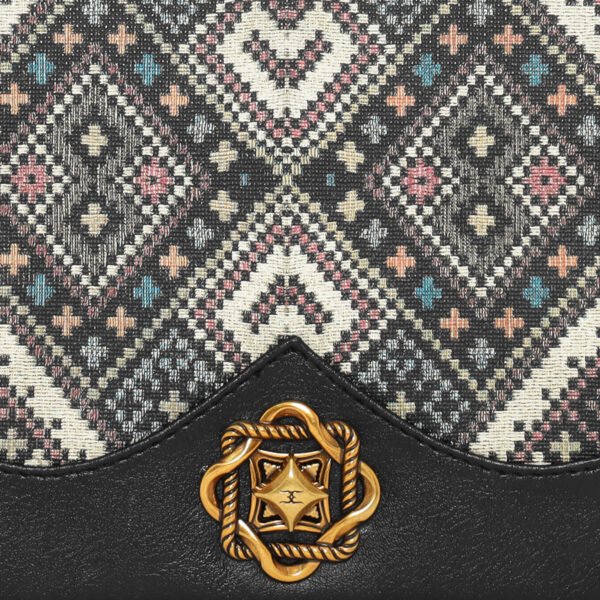 The Esbeda Ethnic Charm Sling combines traditional artistry with modern functionality. it features an eye-catching ethnic pattern on the flap, enhanced with a bold lion emblem closure