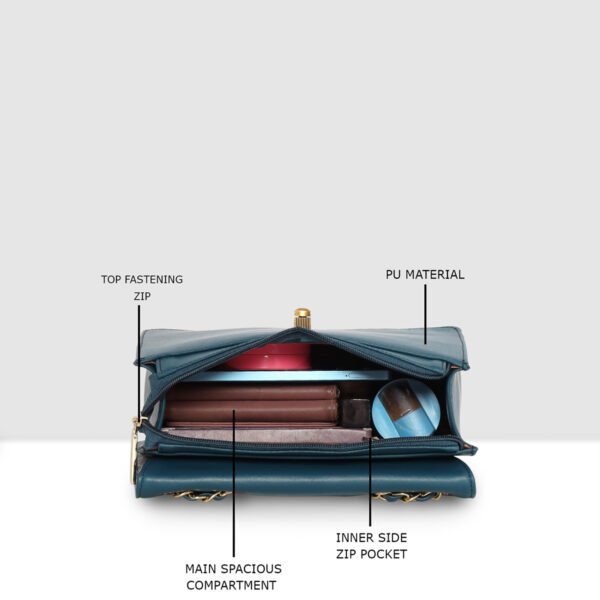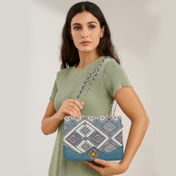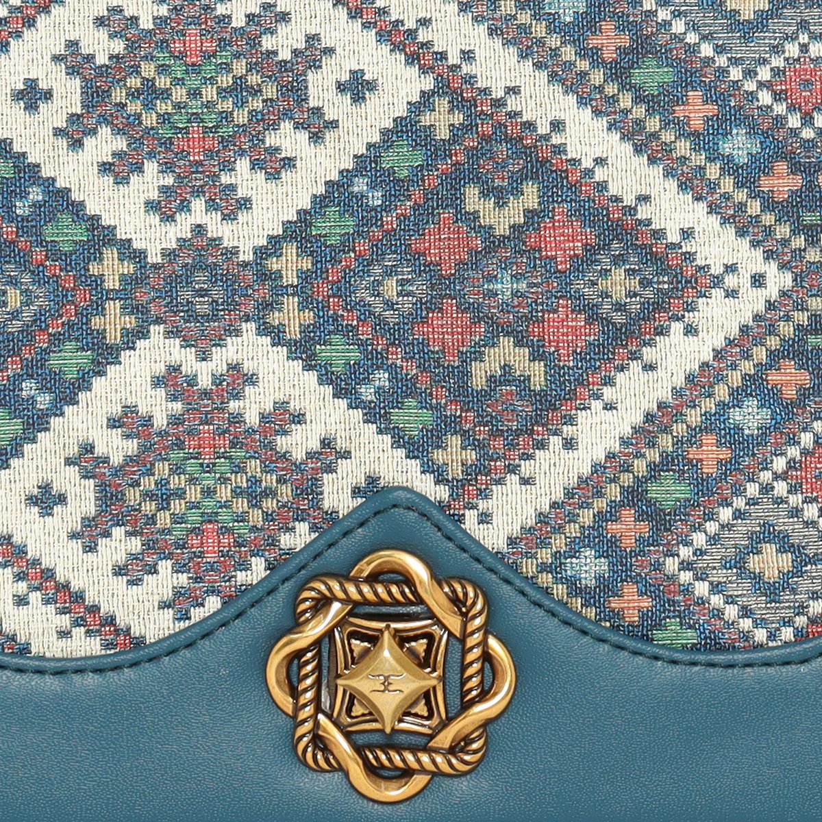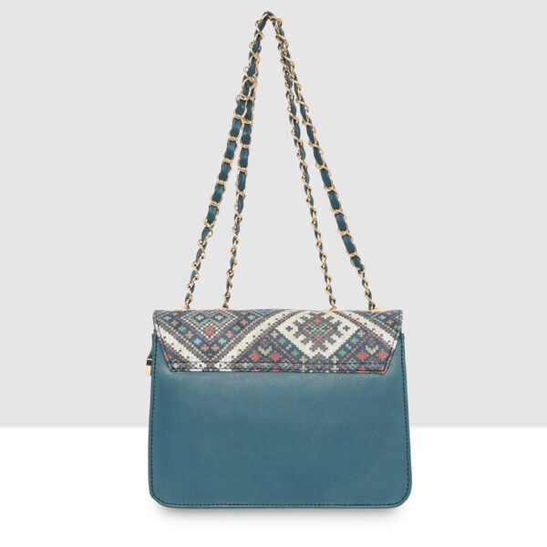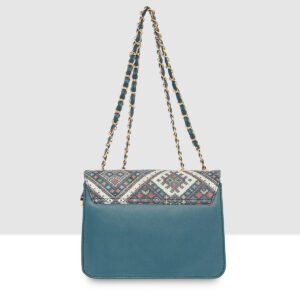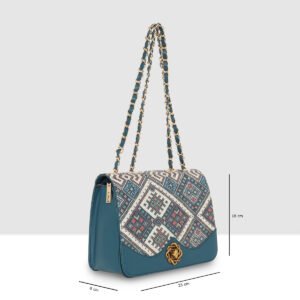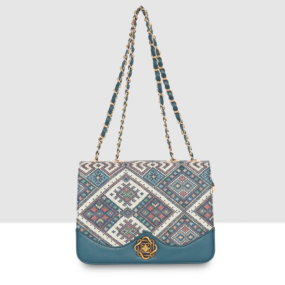 The Esbeda Ethnic Charm Sling combines traditional artistry with modern functionality. it features an eye-catching ethnic pattern on the flap, enhanced with a bold lion emblem closure