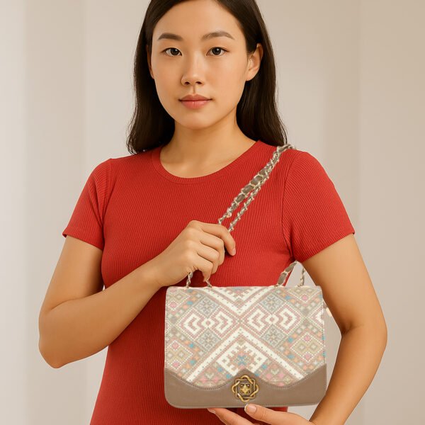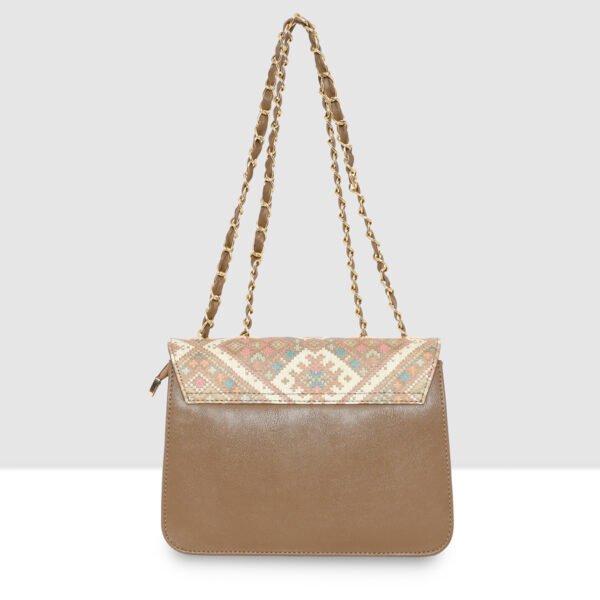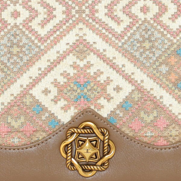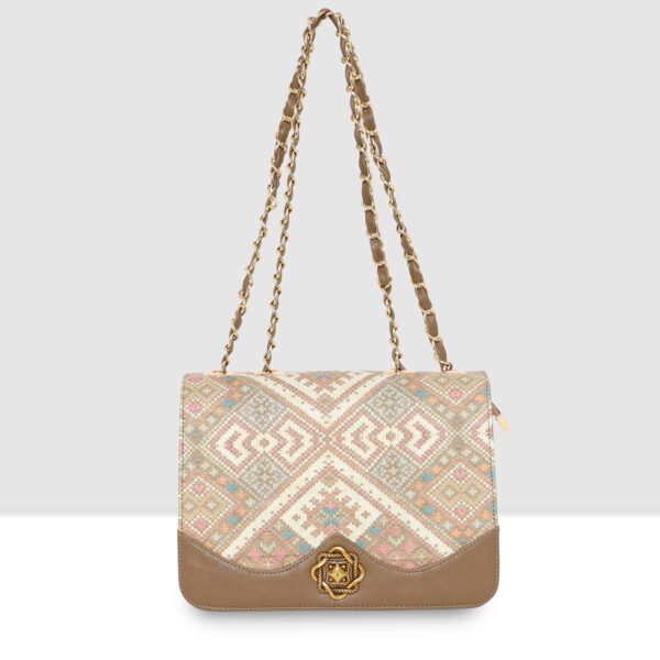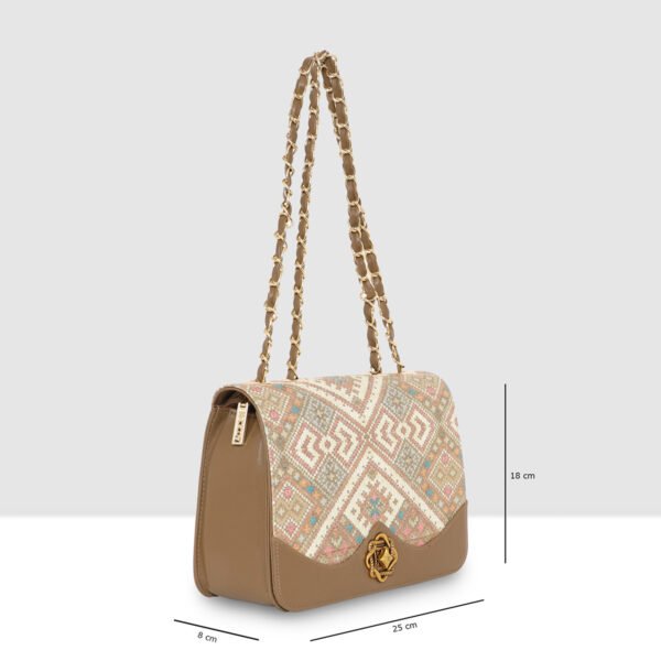 The Esbeda Ethnic Charm Sling combines traditional artistry with modern functionality. it features an eye-catching ethnic pattern on the flap, enhanced with a bold lion emblem closure