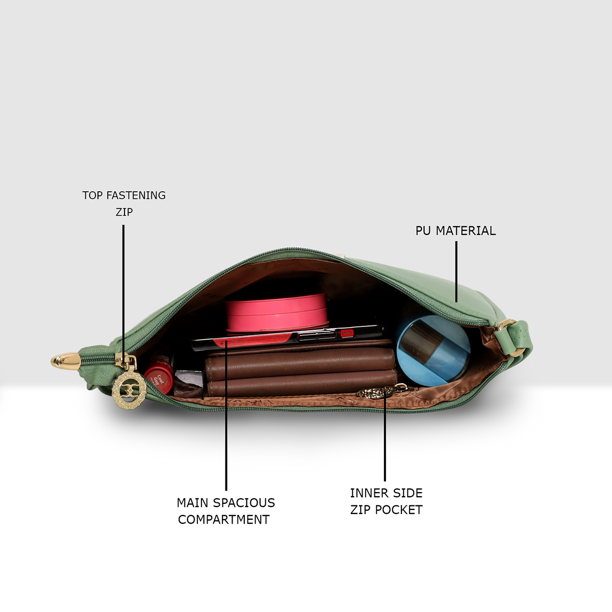 • Spacious Interior: Main compartment provides ample space for essentials like phone, wallet, keys, and cosmetics.