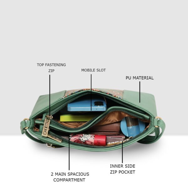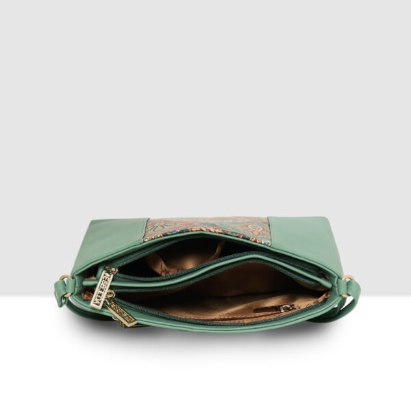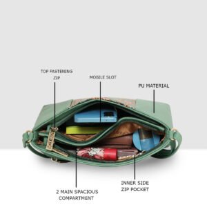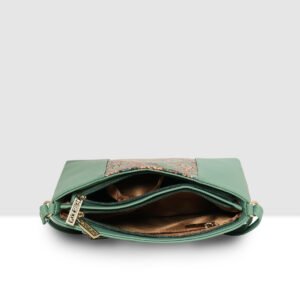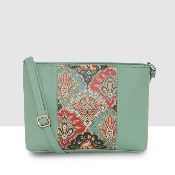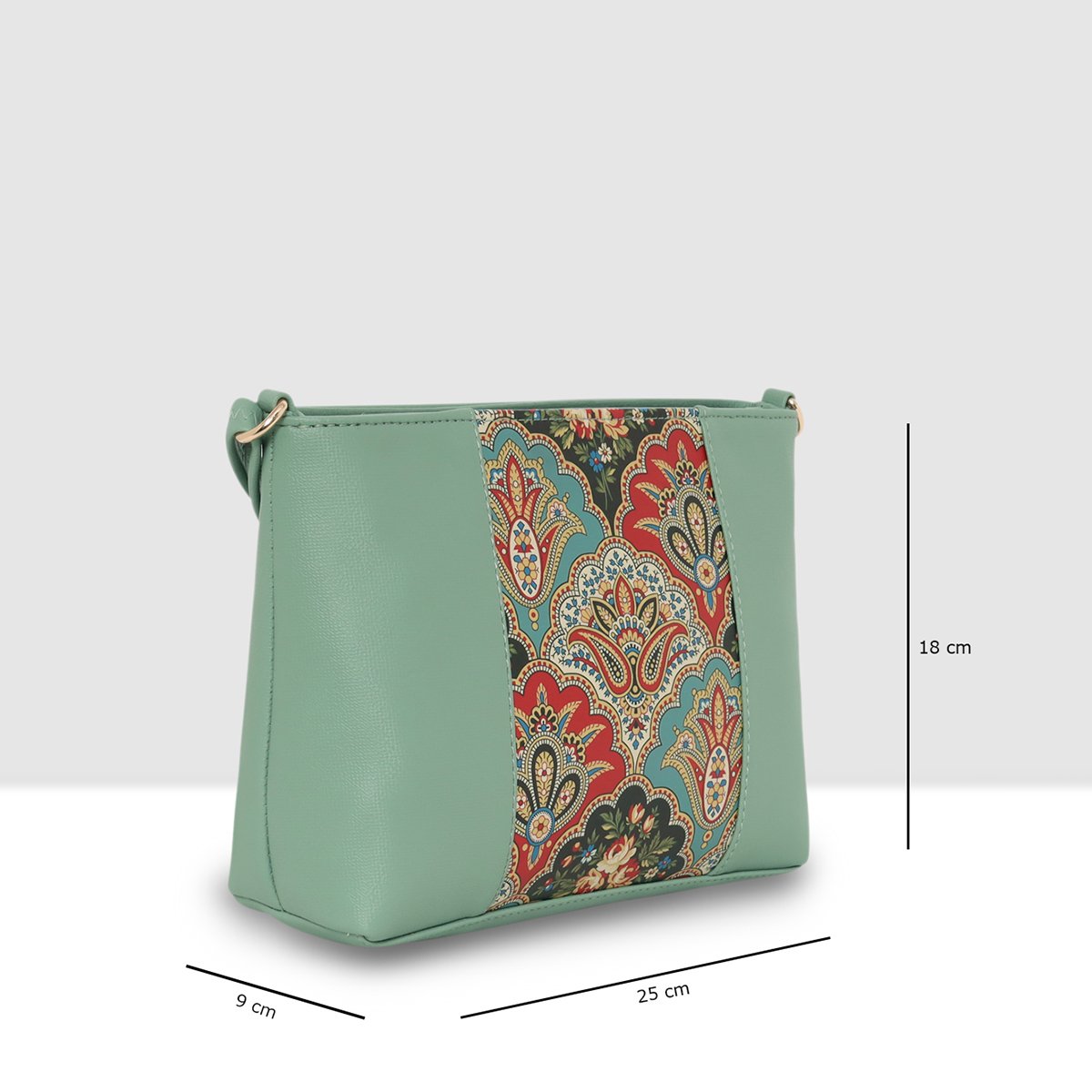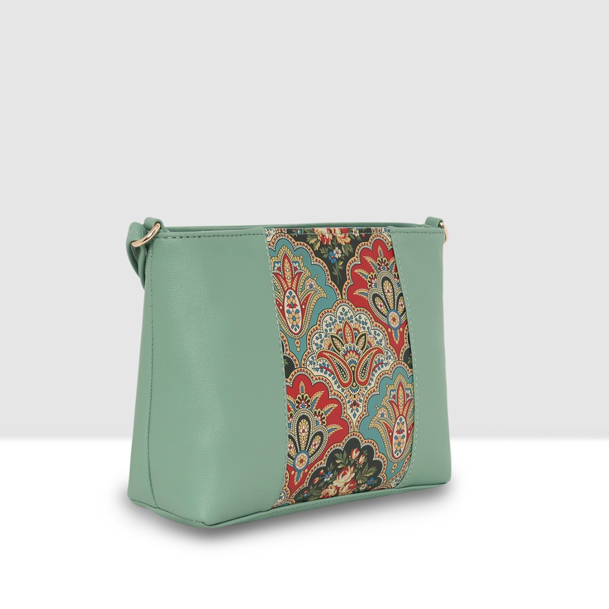 The Esbeda Ethnic Print Panel Slingbag blends traditional charm with modern elegance. Crafted from premium PU material, this Sling Bag features a neutral Solid base highlighted by a bold.