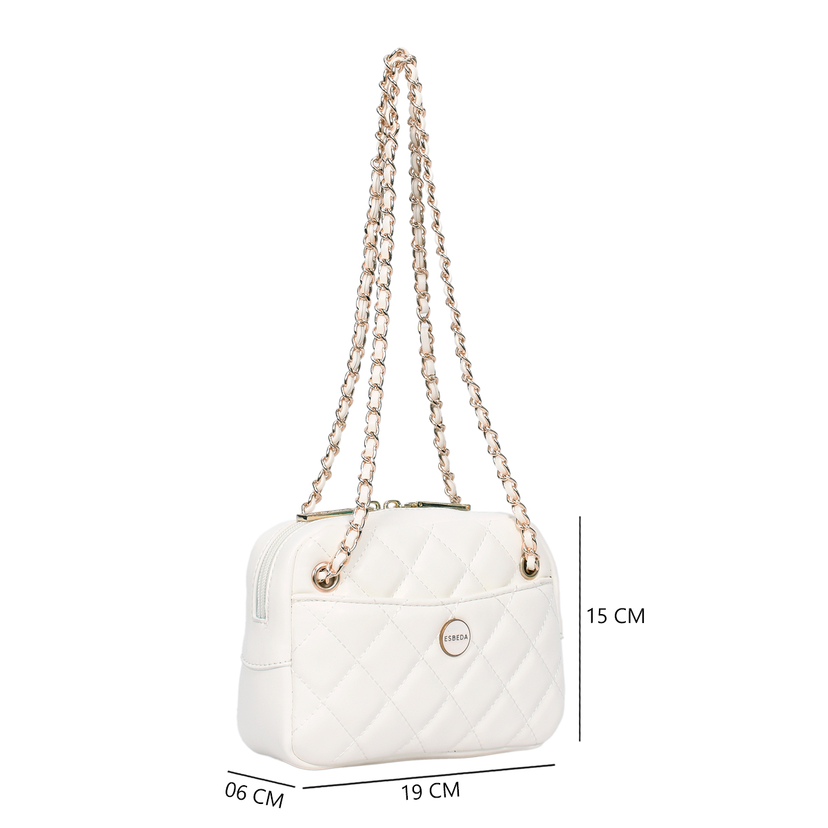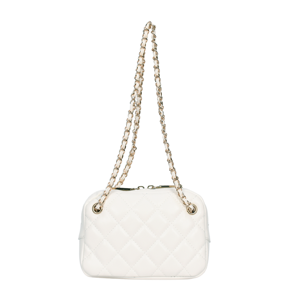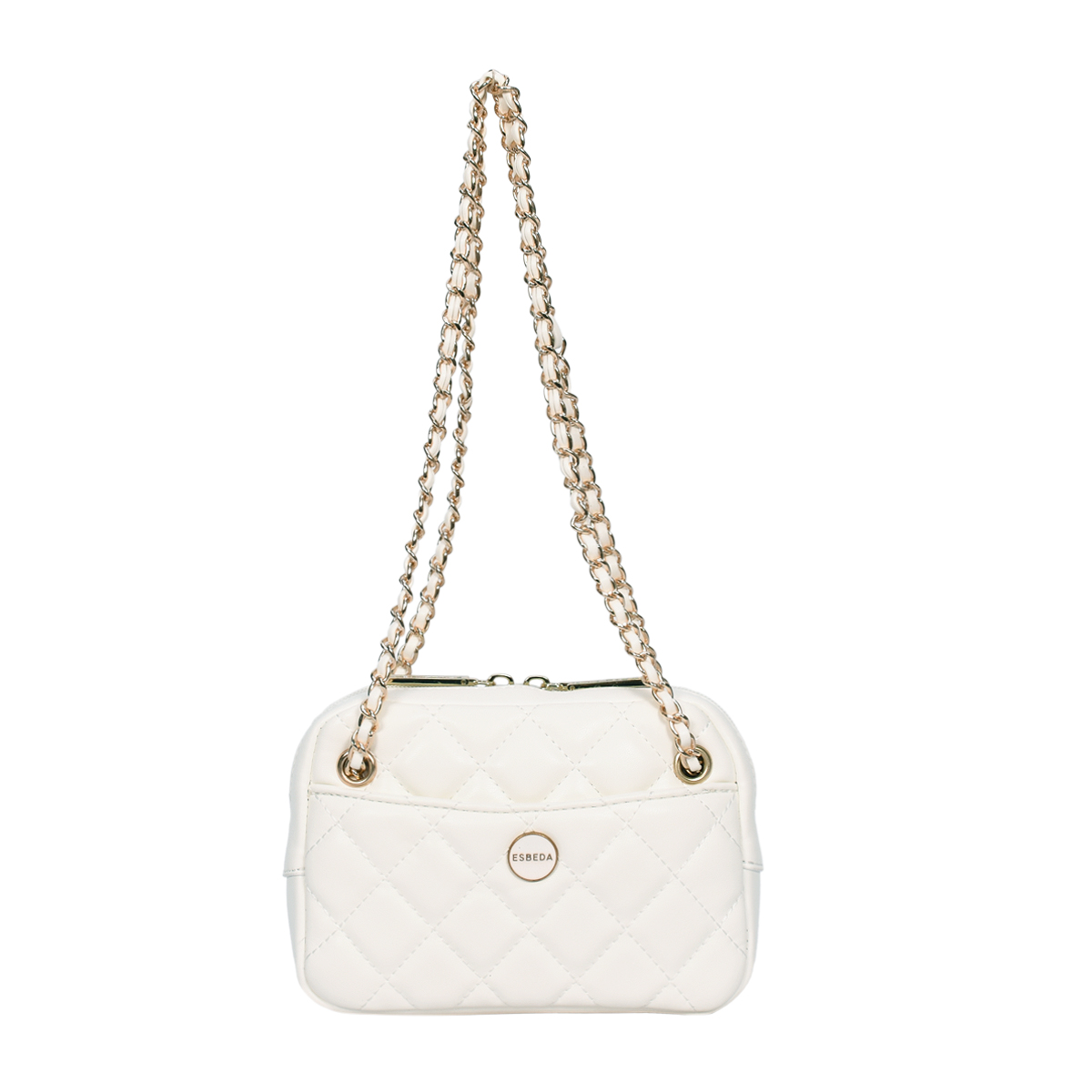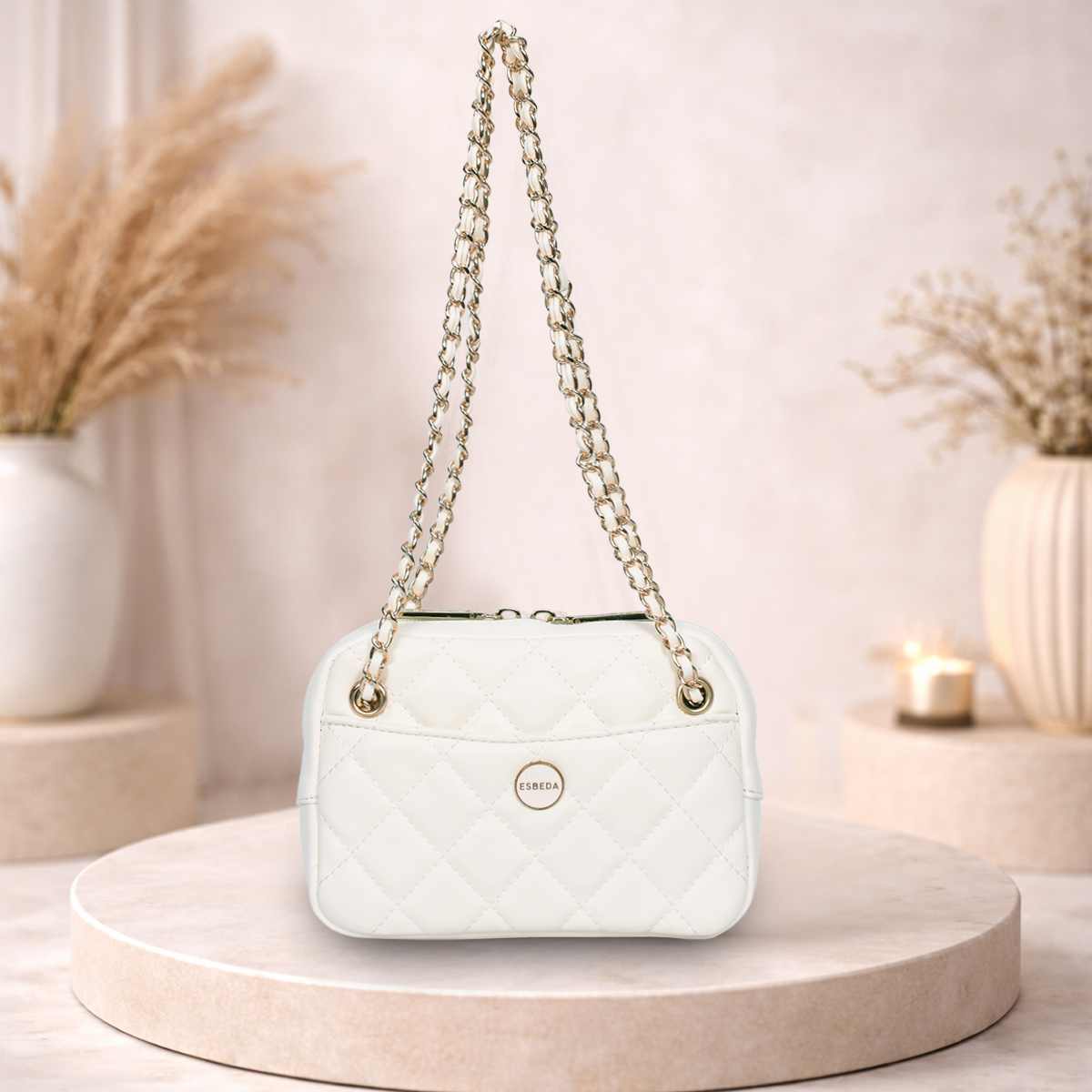 Crafted from premium quality pu, this bag features an elegant quilted texture and a gold-tone chain strap that adds a touch of glamour. Its soft ivory color makes it versatile and easy to pair with any outfit.