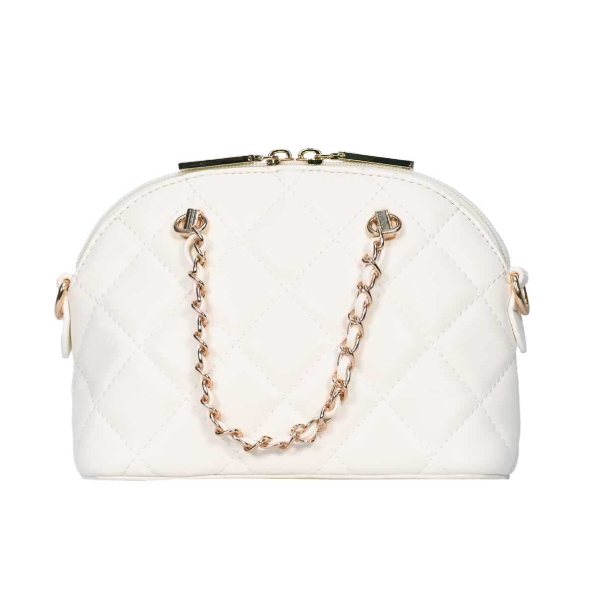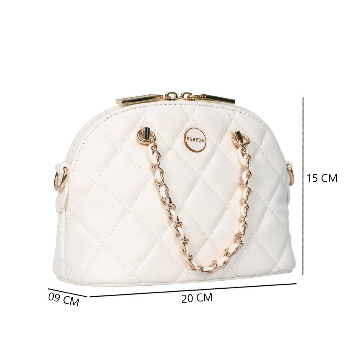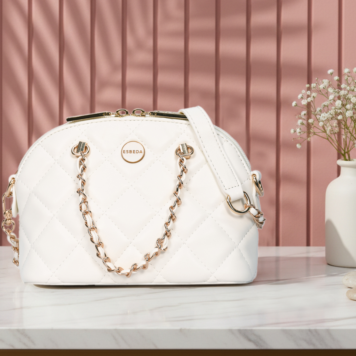 Its dome-shaped structure provides ample space while maintaining a stylish silhouette. The gold-tone chain handle adds a touch of glamour, making it suitable for both day and evening outings. Equipped with smooth dual zippers and protective bottom feet, this slingbag ensures durability and convenience.