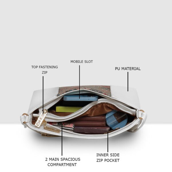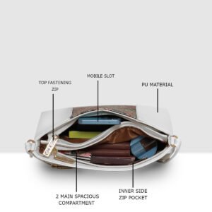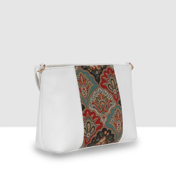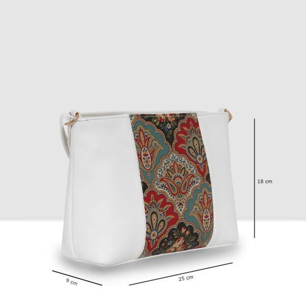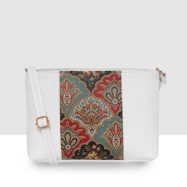 The Esbeda Ethnic Print Panel Slingbag blends traditional charm with modern elegance. Crafted from premium PU material, this Sling Bag features a neutral Solid base highlighted by a bold.